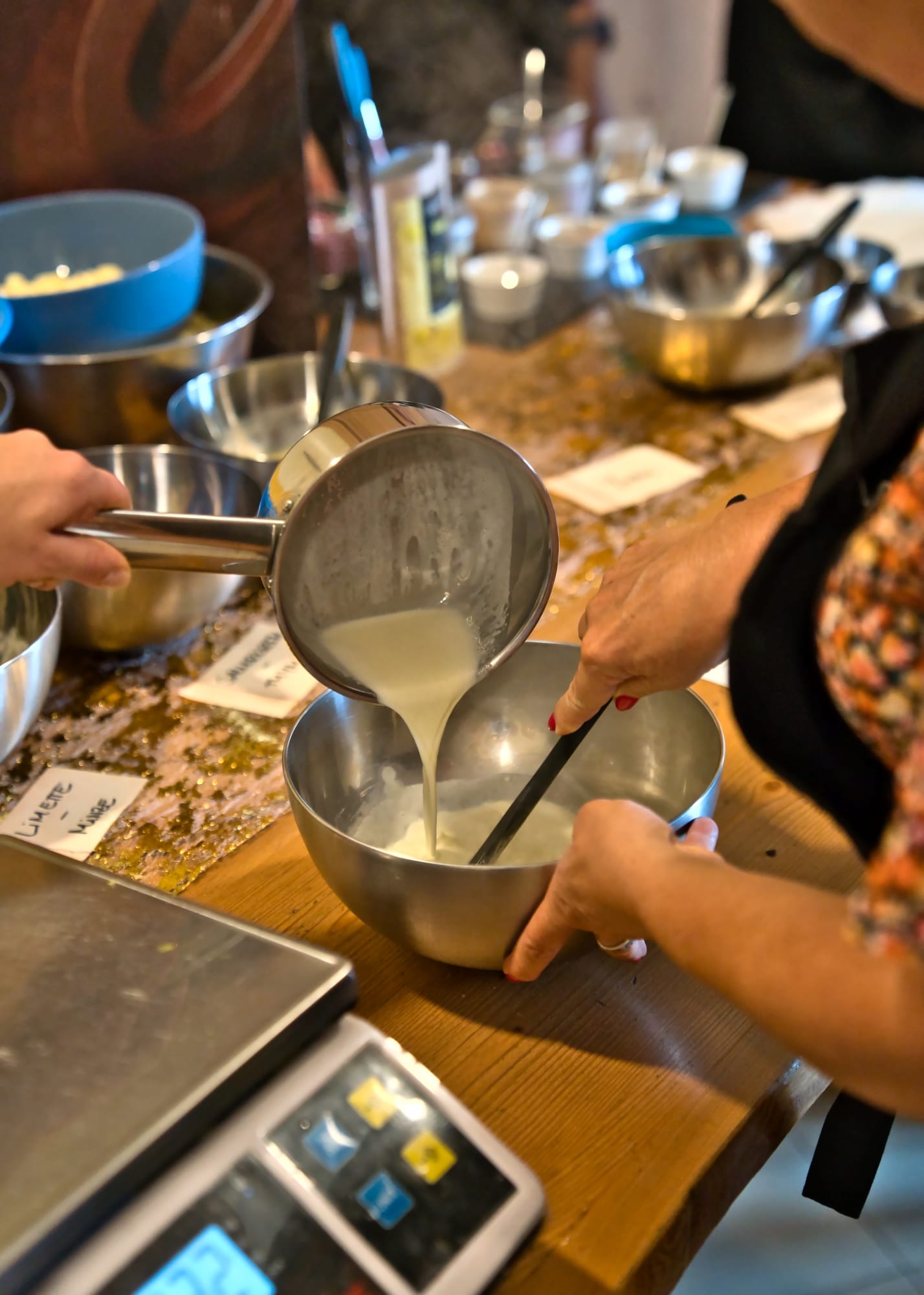 Im Kurs haben wir sommerliche Füllungen wie z.B. Limette-Minze und Sauerkirsch-Thymian kreiert und verschiedene Temperiermethoden wie Impfen und Tablieren gezeigt. Die Pralinenformen wurden mit farbiger Kakaobutter geschminkt und per Hand ausgegossen – eine wahre Kunst für sich!